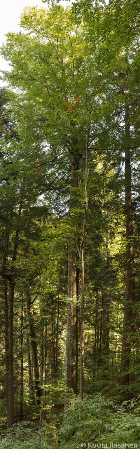 The forest is composed of European silver fir (Abies alba) and European beech (Fagus sylvatica), almost 50% of each. At the highest elevations, there is also a small proportion of Norway spruce (Picea abies) 2. Due to the north-facing slope and shade casting fir and beech, the forest is very shady. The undergrowth is sparse, including blackberry (Rubus sp.) and wood sorrel (Oxalis acetosella), for example.